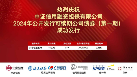 3月22日,由中泰证券担任牵头主承销商和簿记管理人的中证信用融资担保有限公司(下称“中证融担”)2024年面向专业投资者公开发行可续期公司债券(第一期)在深交所成功发行,发行规模15亿元,期限3+N年,票面利率2.75%,为近两年来融资担保公司可续期公司债券最低发行利率。