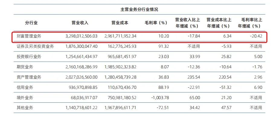实际上,在业绩增长的背景下,中泰证券财富管理业务的表现并不如人意,2023年实现营收32.98亿元,同比下滑17.84%,主要是公司代理买卖证券业务收入同比减少;毛利率10.2%,同比减少20.42%。