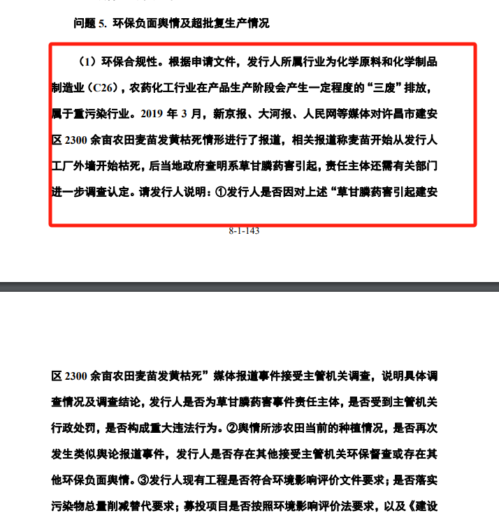 2019年3月,有媒体对许昌市建安区2300余亩农田麦苗发黄枯死情形进行了报道,相关报道称麦苗开始从发行人工厂外墙开始枯死,后当地政府查明系草甘膦药害引起,责任主体还需有关部门进一步调查认定。