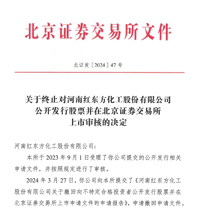 4月24日消息,据北交所审核项目动态,河南红东方化工股份有限公司(以下简称“红东方”)IPO审核状态为“终止”,保荐机构为中泰证券股份有限公司。
