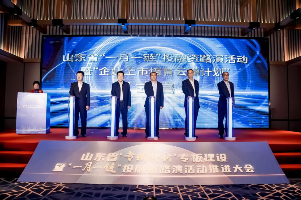 4月26日,由山东省工业和信息化厅、省委金融办、山东证监局主办,中泰证券、齐鲁股权交易中心、中国银行山东省分行和济南市工业和信息化局承办的山东省“专精特新”专板建设暨“一月一链”投融资路演活动推进大会在济南举行。大会启动了山东省“一月一链”投融资路演活动、“山东省中小企业投融资联盟齐鲁行”,发布了“企业上市培育云梯计划”。山东省工业和信息化厅副厅长张庆、省委金融办二级巡视员张明安、山东证监局一级巡视员赵洪军、中泰证券党委副书记吕祥友出席会议。