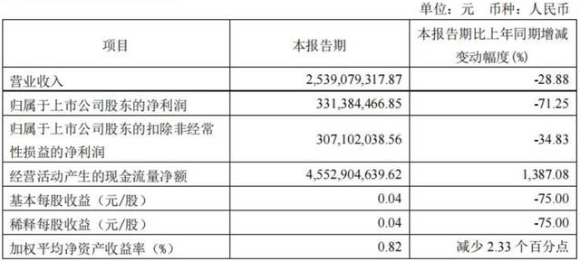 具体来看,投资收益为2.55亿元,同比降70.99%;公允价值变动收益为1.61亿元,同比降70.02%。投资收益与公允价值变动收益合计为4.16亿元,同比降70.62%。