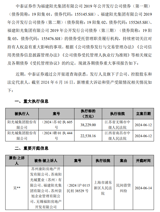 2024年06月26日,中泰证券股份有限公司关于福建阳光集团有限公司新增重大诉讼和资产受限情况的临时受托管理事务报告发布。