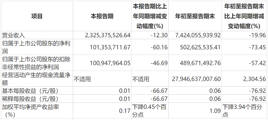 整个前三季度,中泰证券实现营业总收入74.24亿元,相比去年同期的92.76亿元下降19.96%;实现归母净利润5.03亿元,相比去年同期的18.93亿元下降达73.45%。