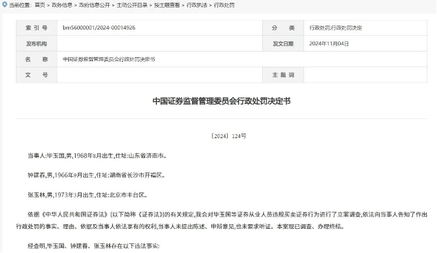根据证监会披露的信息,四名涉案人员分别为毕玉国、尚文彦、钟建春和张玉林。四人分别被罚款250万元、125万元、20万元和38万元。