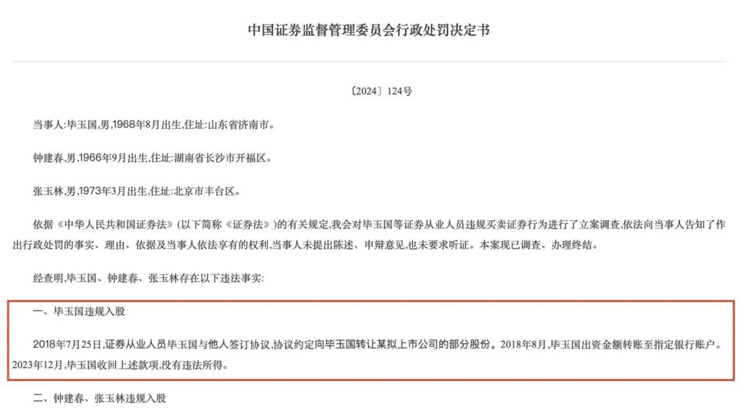 中国证券监督管理委员会行政处罚决定书〔2024〕124号透露,2018年7月25日,证券从业人员毕玉国与他人签订协议,协议约定向毕玉国转让某拟上市公司的部分股份。2018年8月,毕玉国出资金额转账至指定银行账户。2023年12月,毕玉国收回上述款项,没有违法所得。