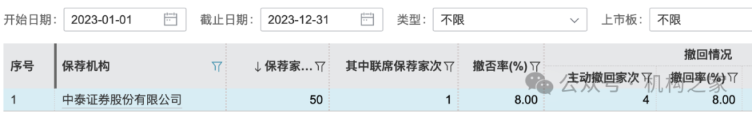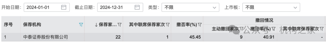 值得注意的是,中泰证券保荐项目撤否率大幅飙升。2024年,中泰证券保荐项目共计22个,主动撤回9家,撤否率达45.45%。相比之下,2023年全年50个保荐项目中仅撤回4家,撤否率仅为8%。