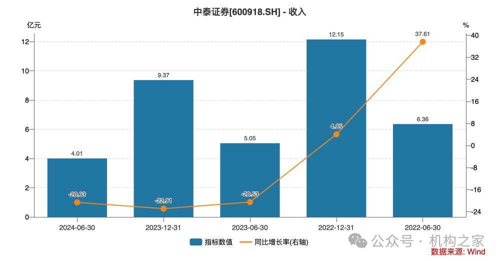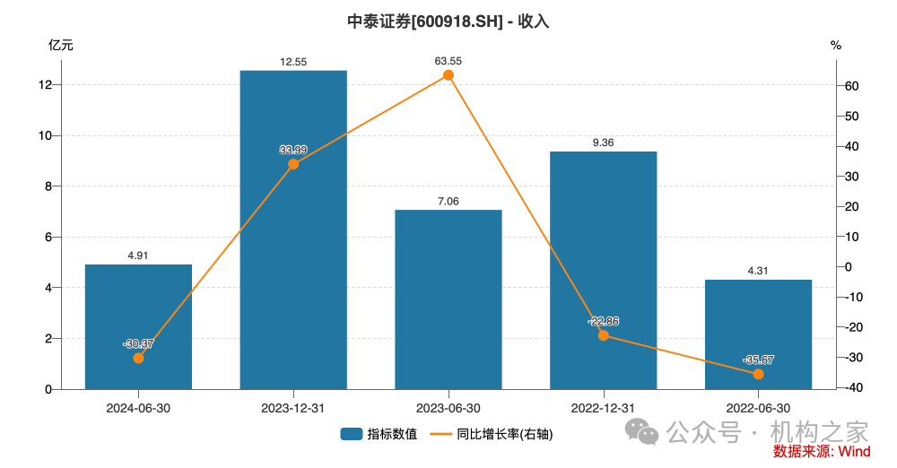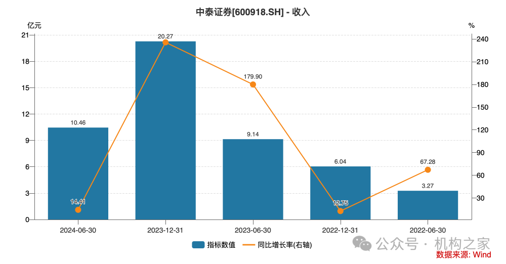 资产管理业务是中泰证券的核心亮点之一,该板块收入近年来呈现出强劲的增长动能。2021年和2022年分别实现同比增长29.85%和12.75%,而2023年更是迎来爆发式增长,同比大幅跃升235.54%,达到20.27亿元的历史新高。在2023年的高基数基础上,2024年上半年依然保持增长势头,收入增加14.41%,达10.46亿元。