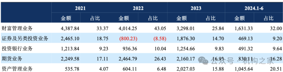从收入构成的具体数据来看,公司多个主要业务板块承压。财富管理业务收入16.31亿元,同比下降4.57%,在营业收入中占比32%。其中,经纪业务收入同比下降9.50%至13.81亿元,这主要受市场交投清淡影响,公司2024年上半年实现股票基金交易额4.62万亿元,同比减少14.77%。
