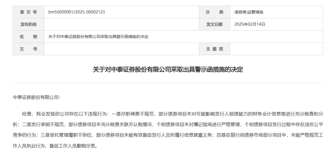 2月14日,中国证监会对中泰证券股份有限公司(以下简称“中泰证券”)采取出具警示函措施。经查,证监会发现中泰证券存在以下违规行为:一是尽职调查不规范,部分债券项目未对可能影响发行人偿债能力的财务会计信息等进行充分核查和分析;二是发行承销不规范,部分债券项目未充分核查关联方认购情况,个别债券项目未对簿记现场进行严格管理,个别债券项目发行过程中存在违反公平竞争的行为;三是受托管理履职不到位,部分债券项目未能有效督促发行人及时履行信息披露义务;四是在银行间债券市场部分项目中,未能严格规范工作人员执业行为,督促工作人员勤勉尽责。证监会决定对中泰证券采取出具警示函的行政监管措施。