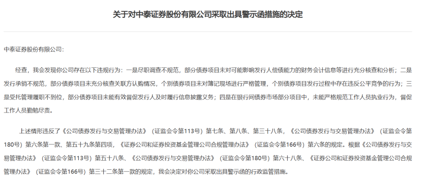 2月14日,证监会在官网发布公告,表示因中泰证券因存在尽职调查不规范、发行承销不规范、受托管理履职不到位等四大违规行为,对其采取出具警示函措施的决定。