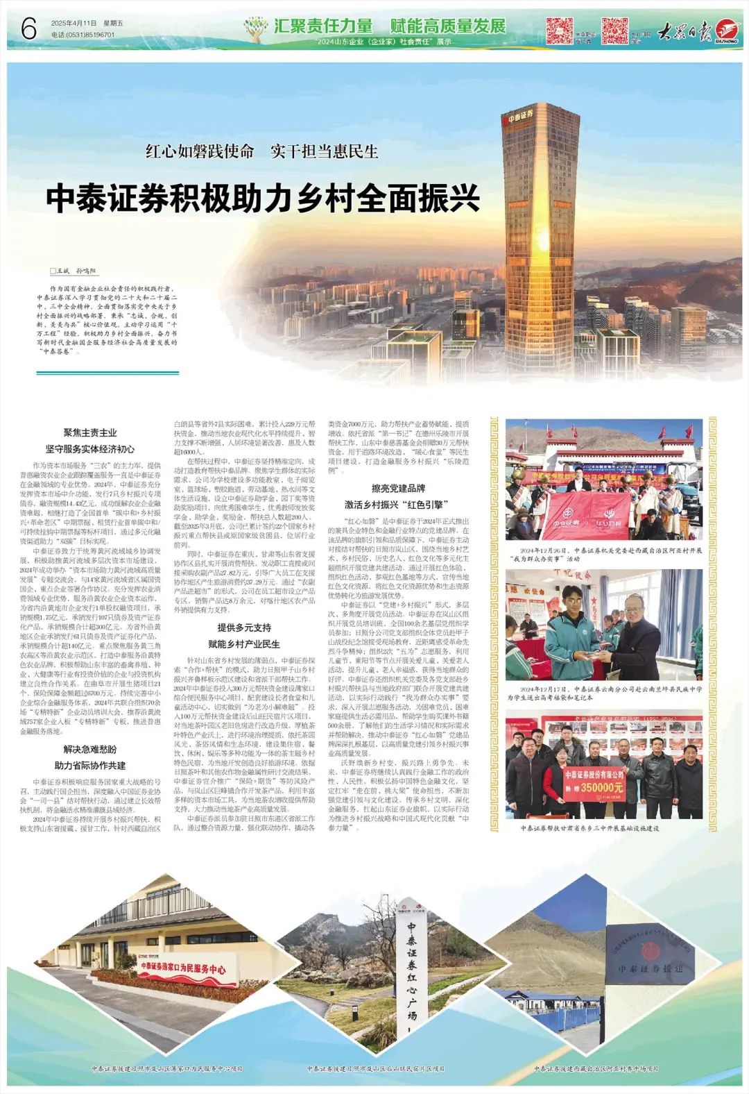 作为国有金融企业社会责任的积极践行者,中泰证券深入学习贯彻党的二十大和二十届二中、三中全会精神,全面贯彻落实党中央关于乡村全面振兴的战略部署,秉承“忠诚、合规、创新、美美与共”核心价值观,主动学习运用“千万工程”经验,积极助力乡村全面振兴,奋力书写新时代金融国企服务经济社会高质量发展的“中泰答卷”。
