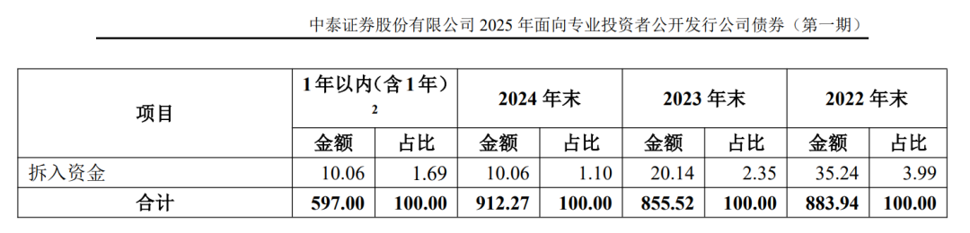 募集说明书披露,截至 2024 年末,中泰证券有息负债余额为912.27 亿元。其中,该公司1 年以内到期的有息负债余额为597.00亿元,占有息负债总额的比例为 65.44%,占比较大,该公司短期债务占比较高。