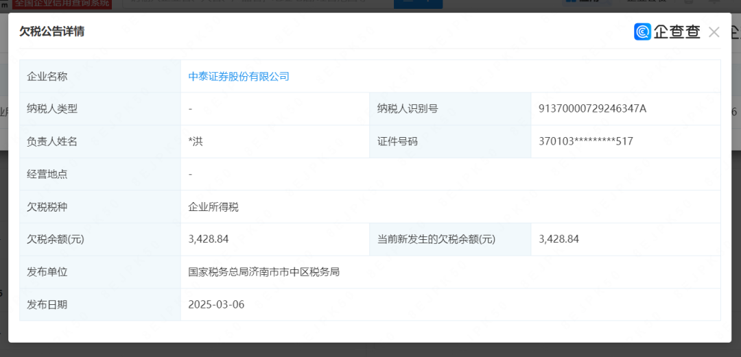 2025年3月6日,国家税务总局济南市市中区税务局发布的欠税公告显示,中泰证券当前新发生欠税金额3428.84元,欠税税种为企业所得税。