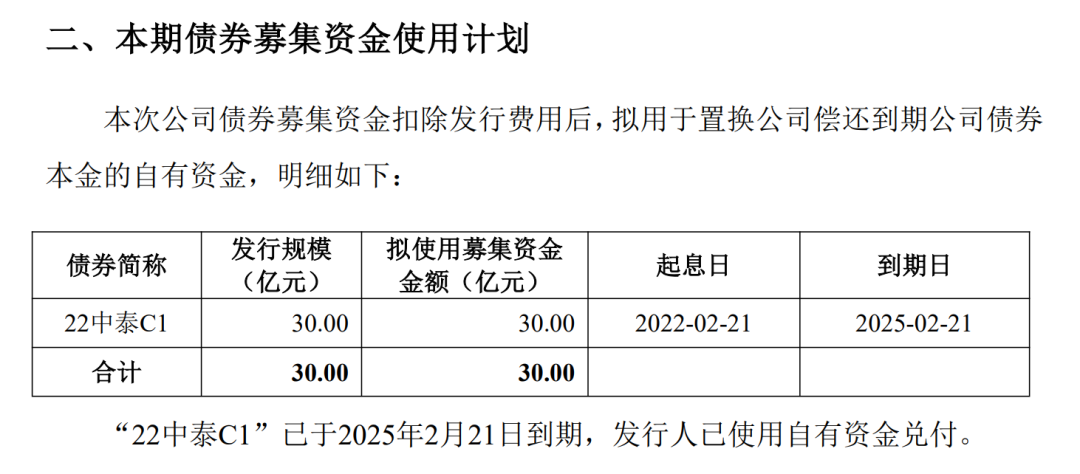 据介绍,中泰证券2025年3月28日获中国证监会出具的《关于同意中泰证券向专业投资者公开发行公司债券注册的批复》,注册规模为不超过200亿元,采取分期发行。本期债券发行金额为不超过 30 亿元(含 30 亿元),募集资金将用于置换该公司偿还到期公司债券本金的自有资金。“22中泰C1”已于2025年2月21日到期,该公司已使用自有资金兑付。