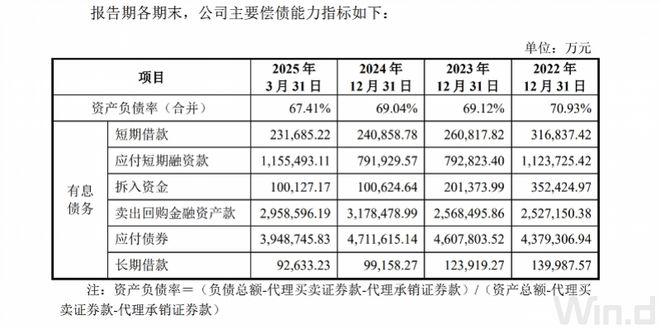 根据公告披露,2022-2024年以及2025年一季度,中泰证券资产负债率分别为70.93%、69.12%、69.04%和67.41%,截至2025年3月31日,公司有息负债总额为848.73亿元,其中短期借款、应付短期融资款、拆入资金、卖出回购金融资产款等短期债务占比为52.38%。