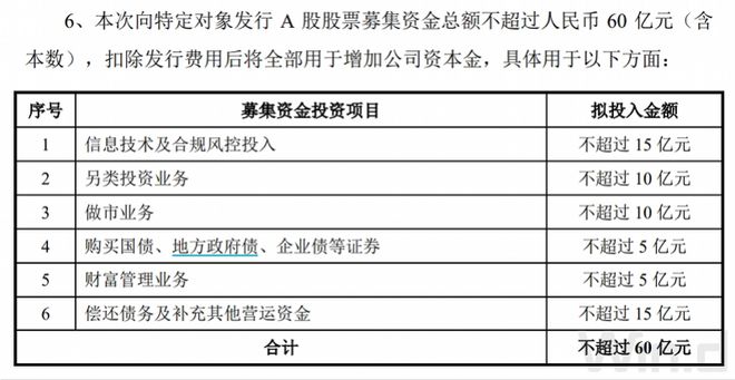 在修点后的《募集说明书》中,中泰证券计划60亿元募集资金的分配方式为:信息技术及合规风控投入15亿元、另类投资10亿元、做市业务10亿元、债券投资5亿元、财富管理5亿元、偿债及营运资金15亿元。