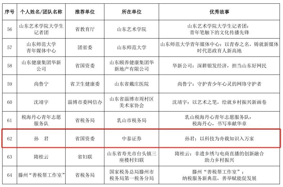 为持续打造“好网民·在山东”品牌项目,唱响时代主旋律,传播网络正能量,2025年“好网民·在山东”故事征集活动4月起在全省范围内开展。经过专家评审,综合考虑社会影响力、传播力、创新性、覆盖面等因素,最终从近1000篇故事中选取100个“好网民·在山东”主题活动优秀故事。其中,中泰证券员工孙君凭借《以科技为舟载知识入万家》主题故事入选。