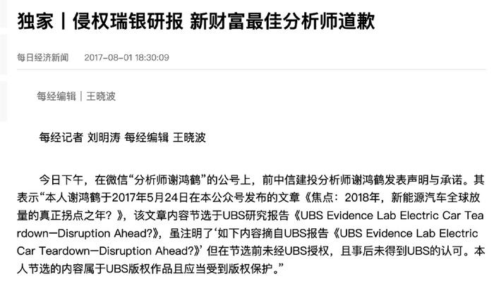 3 、不过记录也显示,谢鸿鹤曾经因为抄袭 UBS 的报告道歉,看来人人都有不堪的过去,没事。