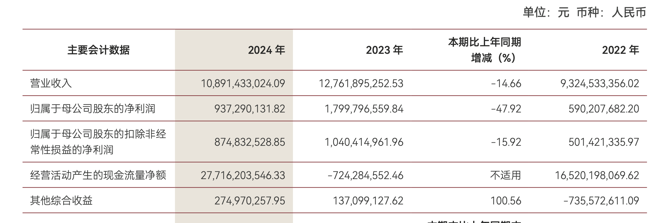 在离任事件之外,中泰证券自身的经营状况同样处于转折点。从2021年开始,公司业绩始终处于较大的波动状态,在2023年经历了大幅反弹后,又于2024年陷入了低谷:全年实现营业收入108.91亿元,同比下降14.66%;实现归属于母公司股东的净利润9.37亿元,同比大幅下滑47.92%。