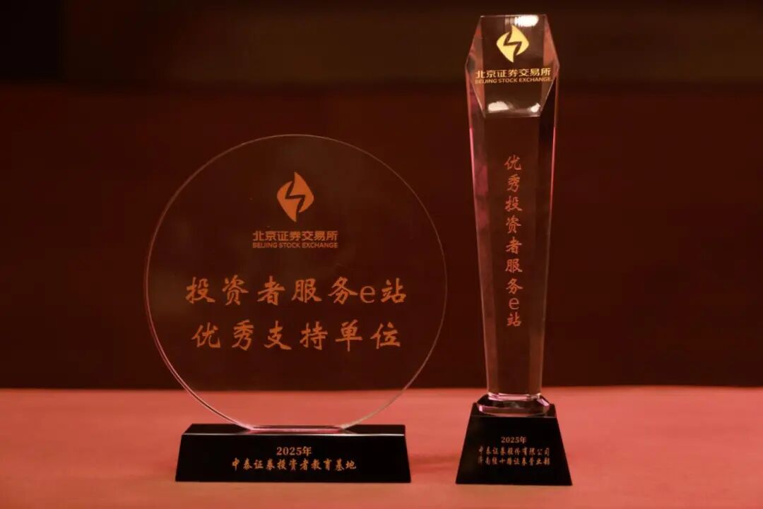 2025年9月25日,在北京证券交易所召开的投资者服务e站经验交流会上,中泰证券投教基地荣获“投资者服务e站优秀支持单位”,中泰证券济南分公司经十路营业部荣获“优秀投资者服务e站”称号。