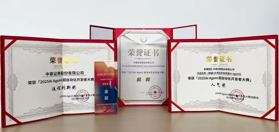 9月27日,由RPA中国主办的2025 AI Agent(智能体)超自动化开发者大赛决赛在苏州举行。大赛以“开发向新,智创未来”为主题,旨在响应国家数字经济发展与“人工智能+”行动计划号召,聚焦AI Agent与超自动化技术融合创新。中泰证券运营中心申报的《AI Agent驱动的智慧运营新范式——证券公司投资交易运营场景实践》项目荣获企业组金奖,中泰证券柜台市场管理部与科技研发部联合开发的《蜂巢小R-柜台市场灵犀AI Agent》项目荣获企业组流程创新奖及最具人气奖。