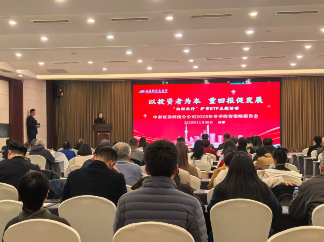 2025年11月30日,由 中泰证券 金融产品部、投资者教育基地、 中泰证券 西南分公司联合上海证券交易所、 万家基金 在四川成都联合举办“以投资者为本,重回报促发展”沪市ETF主题活动。本次活动紧扣“向新而行”主题,聚焦政策新环境与中长期投资机遇,为投资者提供了一场兼具前瞻视野与实战价值的策略盛宴,获得与会者的热烈反响。