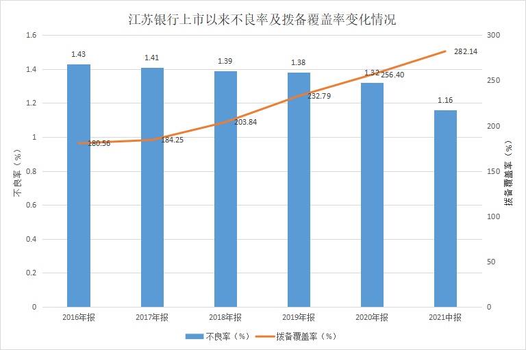 江苏银行于2007年1月24日正式挂牌开业,总部位于江苏南京。2016年8月2日,在上交所上市。2016-2021年上半年,江苏银行不良率实现了6连降,拨备覆盖率则实现了6连升。