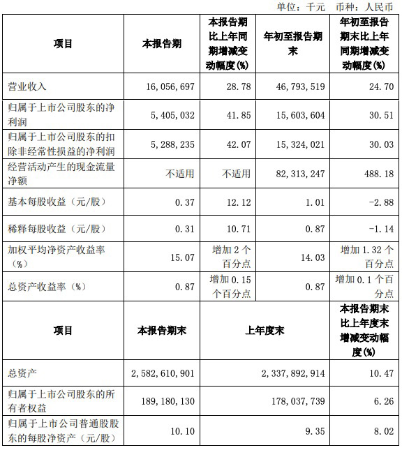 三季报数据显示,截至三季度末,江苏银行总资产2.58万亿元,较上年末增长10.47%,各项存款1.48万亿元,较上年末增长12.93%,各项贷款1.38万亿元,较上年末增长14.59%。前三季度利息净收入339.93亿元,同比增长28.15%;手续费及佣金净收入44.71亿元,在去年高基数的情况下同比增长21%。净资产收益率14.03%,同比提升1.32个百分点,其中第三季度单季净资产收益率15.07%,同比提升2个百分点。其中,