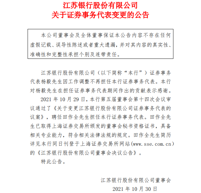2021年10月29日,本行第五届董事会第十四次会议审议通过了《关于变更江苏银行股份有限公司证券事务代表的议案》,聘任田作全先生担任本行证券事务代表。