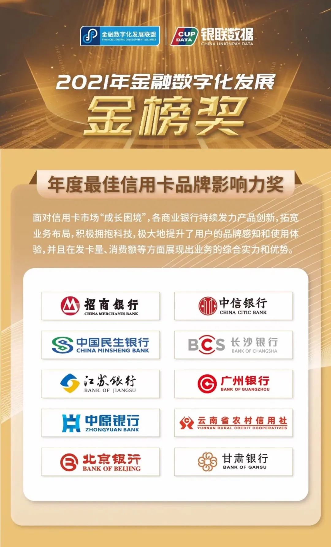 2021年,联盟根据《2021消费金融数字化转型主题调研报告》中各机构的指标评价表现,综合评选了“2021年金融数字化发展金榜奖”。在众多金融机构中,江苏银行喜获“年度最佳信用卡品牌影响力”奖。