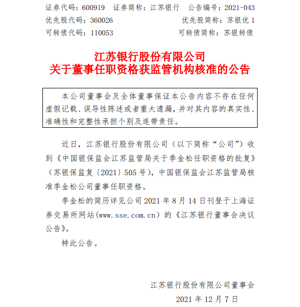 12月7日,江苏银行(600919)发布公告称,中国银保监会江苏监管局公司核准季金松公司董事任职资格。