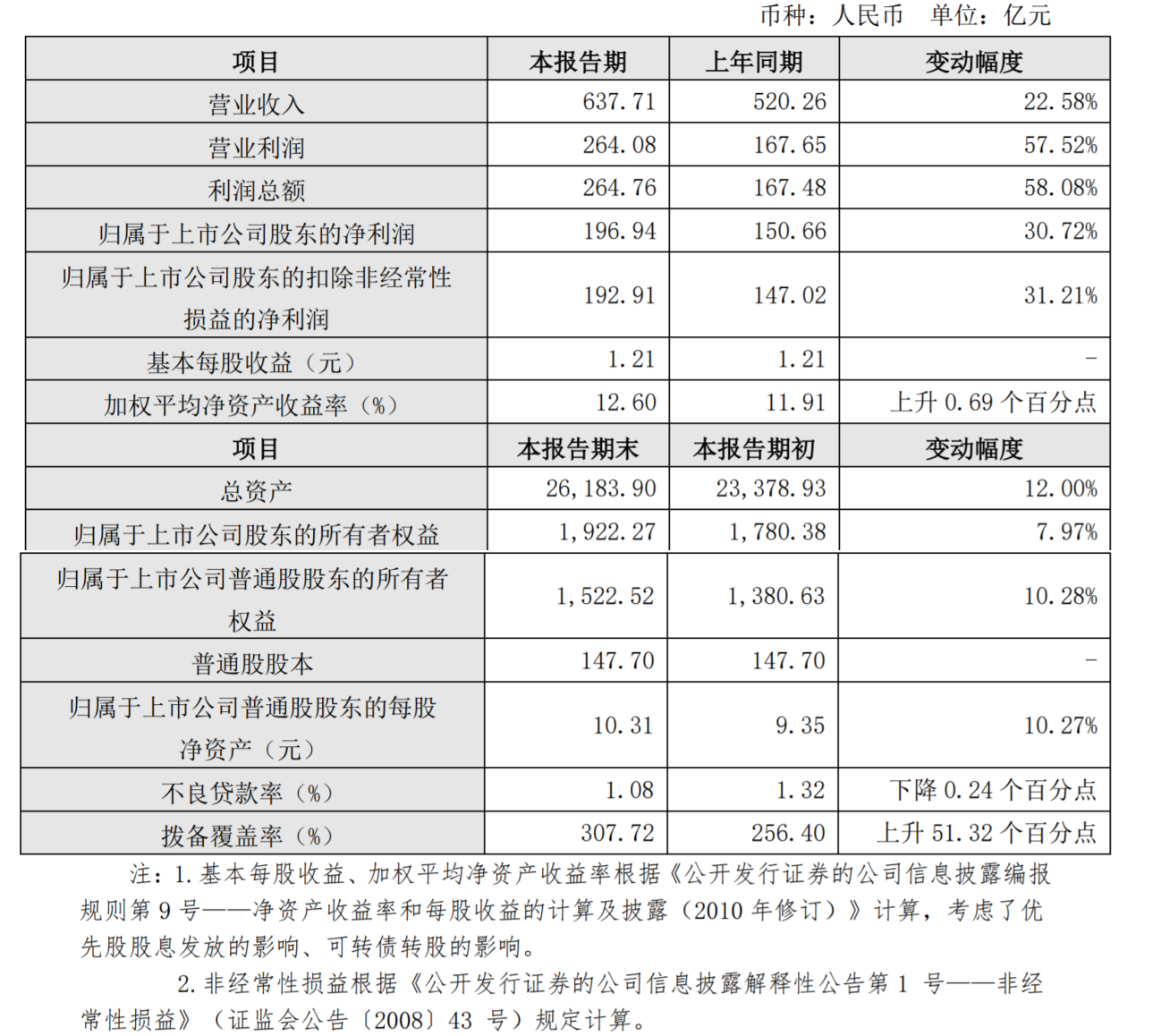 公告显示,报告期内,江苏银行实现营业收入637.71亿元,同比增长22.58%;归属于上市公司股东的净利润196.94亿元,同比增长30.72%。报告期末,不良贷款率1.08%,较期初下降了0.24个百分点,上市六年来逐年下降。拨备覆盖率307.72%,较期初提升了51.32个百分点,上市六年来逐年提升。