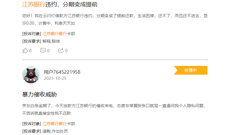 通过黑猫投诉信息可以发现,虽然江苏银行的很多贷款是通过金融科技公司发放,但是承担电话催收工作的却是江苏银行。