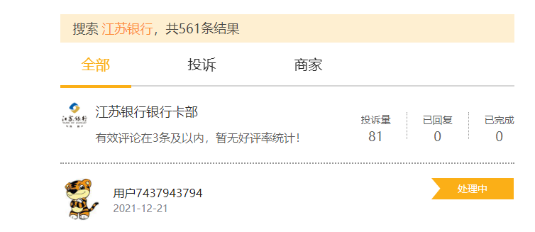 有趣的是,零售金融业务因为涉及个体基数大,故而常常遭遇各类用户投诉,而笔者在黑猫投诉搜索“江苏银行”后发现,仅有561条结果。