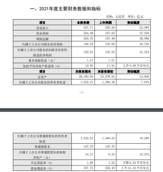 江苏银行2021年业绩快报显示:报告期内,实现营业收入637.71亿元,同比增长22.58%;归属于上市公司股东的净利润196.94 亿元,同比增长30.72%。