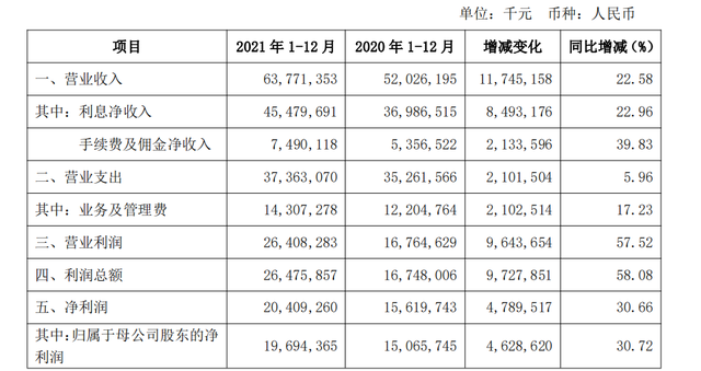 数据显示,截至2021年末,江苏银行资产总额26189亿元,较上年末增长12.02%。与此同时,公司在2021年实现营业收入637.71亿元,同比增长22.58%;归属于上市公司股东的净利润196.94亿元,同比增长30.72%。