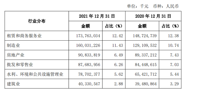在公司的各项贷款中,占比排名前三的行业分别为租赁和商务服务业、制造业和房地产业。从数据可以看出,公司向租赁和商务服务业、制造业发放贷款占比有所提升,而为房地产业发放贷款的比例,从上年的7.43%下降至6.49%。