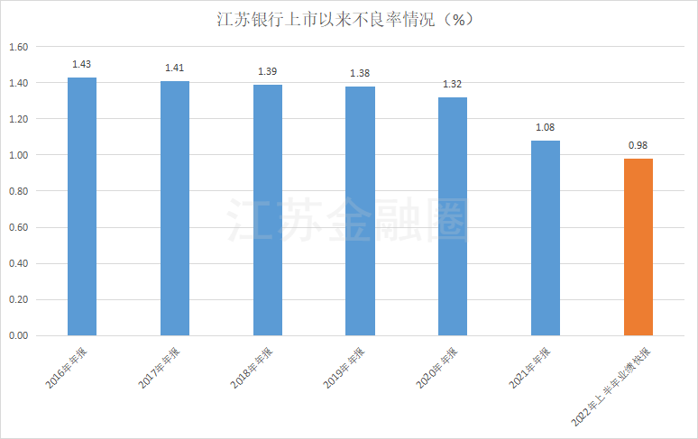 江苏银行上市六年来不良贷款率逐年下降,尤其是近两年,风控成果突出,继2021年末首次降至1.08%后,于今年年中首次降至1%以下,达到了0.98%,实现重大突破的同时,不良率下降幅度也超过多家城商行。