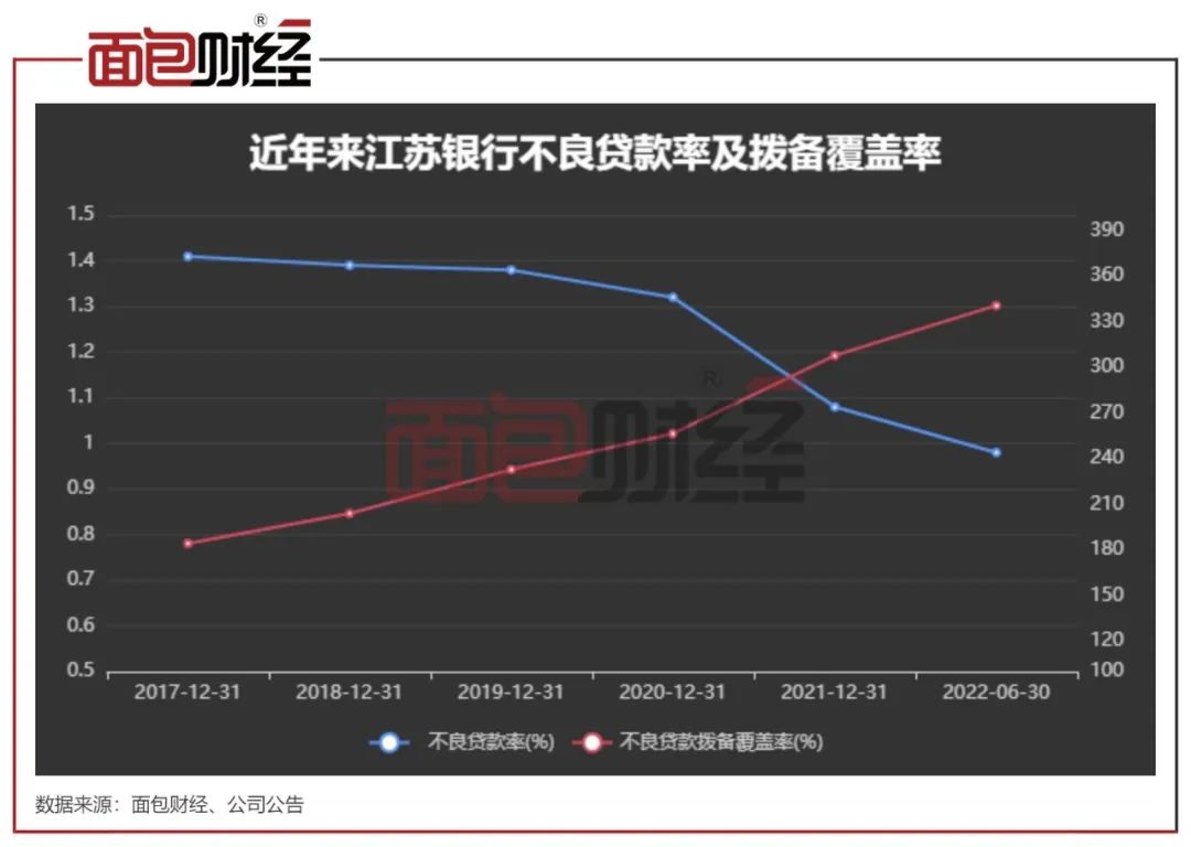 从资产质量来看,近年来,该行资产质量稳中有升。数据显示,截至2022年上半年末,江苏银行不良贷款率0.98%,较上年末下降0.1个百分点。