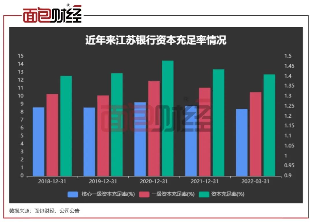 截至2022年一季末,江苏银行的资本充足率指标全面下降。截至2022年一季度末,江苏银行核心一级资本充足率8.41%;一级资本充足率10.52%;资本充足率为12.75%,分别较上年末下降0.37个百分点、0.55个百分点以及0.63个百分点。