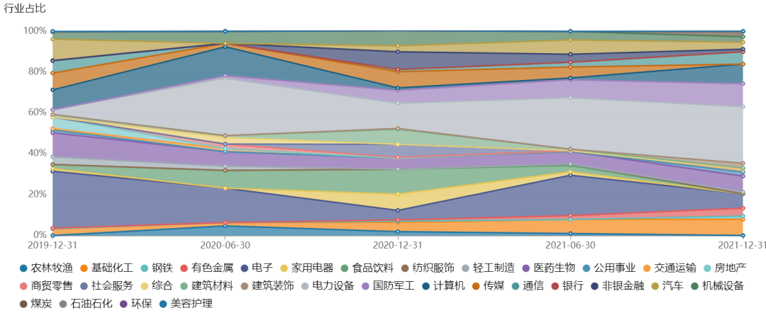 行业配置方面,华安沪港深外延增长是一只聚焦成长类机会的产品,在2021年紧抓景气赛道,重点配置了电力设备、电子和国防军工,抓住了“新半军”爆发的行情,取得了不错的绩效。