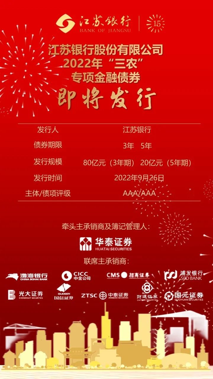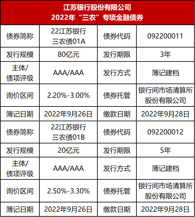2022年9月26日,江苏银行将在全国银行间债券市场发行2022年“三农”专项金融债券。本次债券期限为3年和5年两个品种,发行金额分别为80亿元和20亿元,主体与债项评级均为AAA,托管场所为银行间市场清算所股份有限公司。