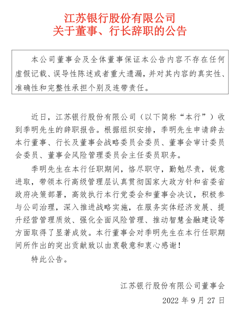 9月26日,江苏银行(600919)公告,原行长季明申请辞去一系列相关职务。董事会同意聘任葛仁余接替季明,担任行长一职。