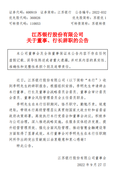江苏银行日前发布公告称,近日,江苏银行股份有限公司(以下简称“本行”)收到季明先生的辞职报告。根据组织安排,季明先生申请辞去本行董事、行长及董事会战略委员会委员、董事会审计委员会委员、董事会风险管理委员会主任委员职务。