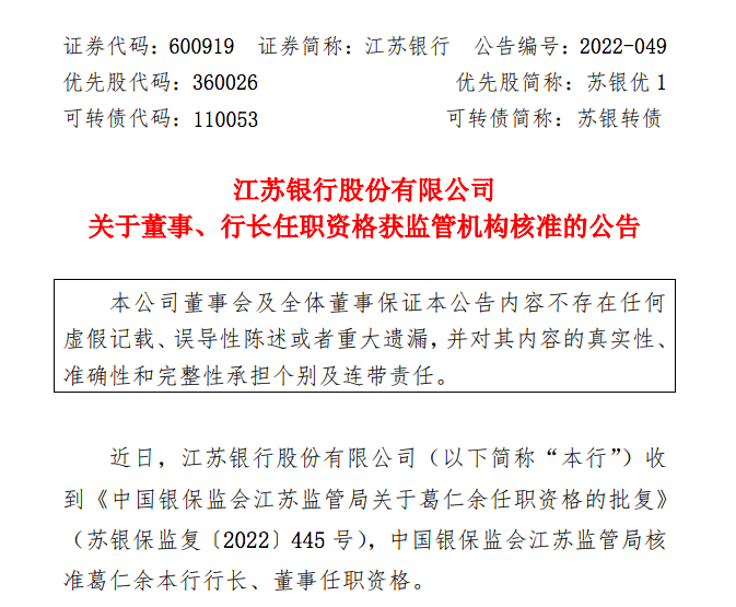 12月14日,江苏银行公告称,近日收到《中国银保监会江苏监管局关于葛仁余任职资格的批复》(苏银保监复〔2022〕445号),中国银保监会江苏监管局核准葛仁余江苏银行行长、董事任职资格。