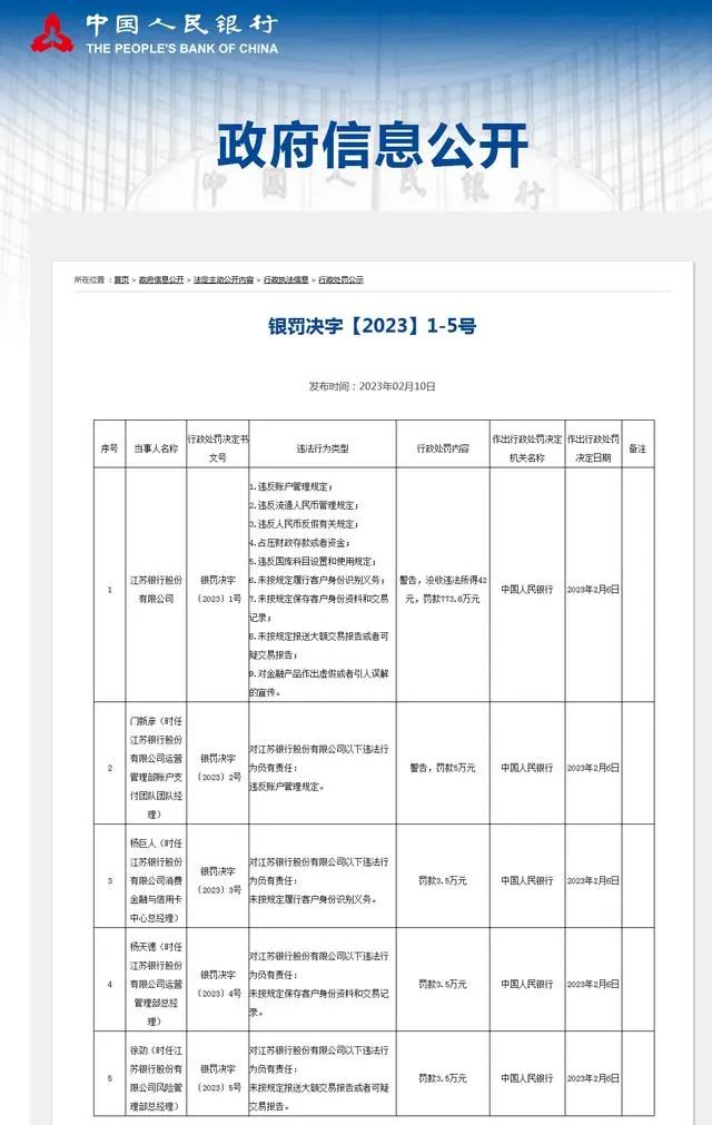 行政处罚信息显示,江苏银行违法行为类型包括: