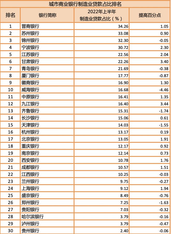 而在制造业贷款的占比指标方面,2022年6月末,30家城市商业银行制造业贷款占比在2.4%(贵州银行)到34.26%(晋商银行)之间,且有14家城市商业银行制造业贷款占比有不同程度减少,16家有所提高,提高最多的是九江银行,同比提高3.44个百分点,减少最多的是威海市商业银行,同比降低了4.46个百分点。