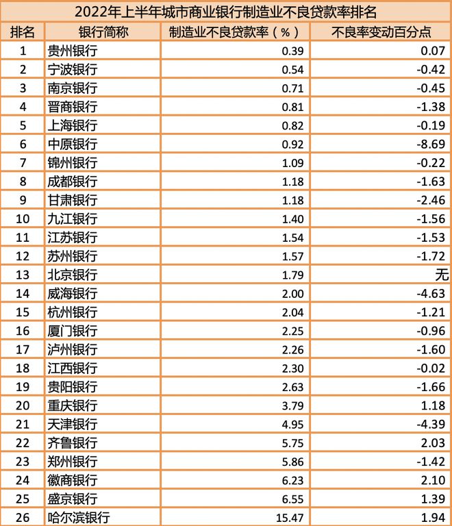 从不良率指标来看,30家城市商业银行中,有数据的24家银行制造业不良贷款总额262.84亿元,其中绝对值最高的是徽商银行的46.96亿元,对应不良率6.23%,绝对值最低的是贵州银行的0.22亿元,对应不良率0.39%,制造业贷款不良率指标方面,有4家无对应数据,不良率最高的是哈尔滨银行的15.47%,最低的则是贵州银行的0.39%。