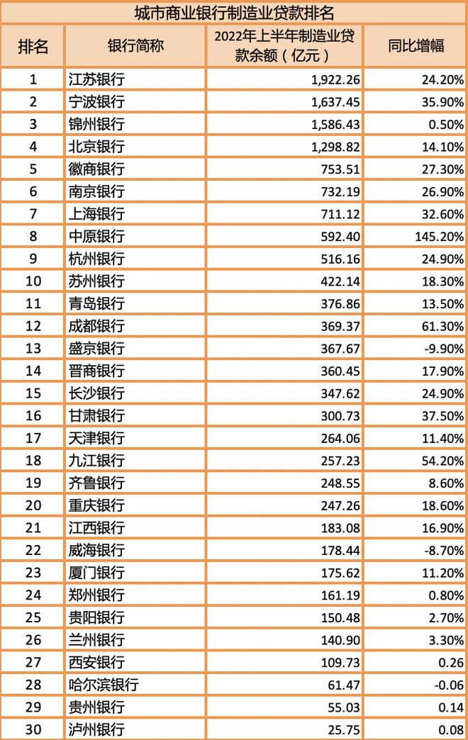 2022年6月末,30家城市商业银行制造业贷款余额合计1.46万亿元,同比增长21.5%,其中江苏银行绝对值最高,制造业贷款余额1922.26亿元,同比增长24.2%,增幅方面中原银行最高,达到145.2%。